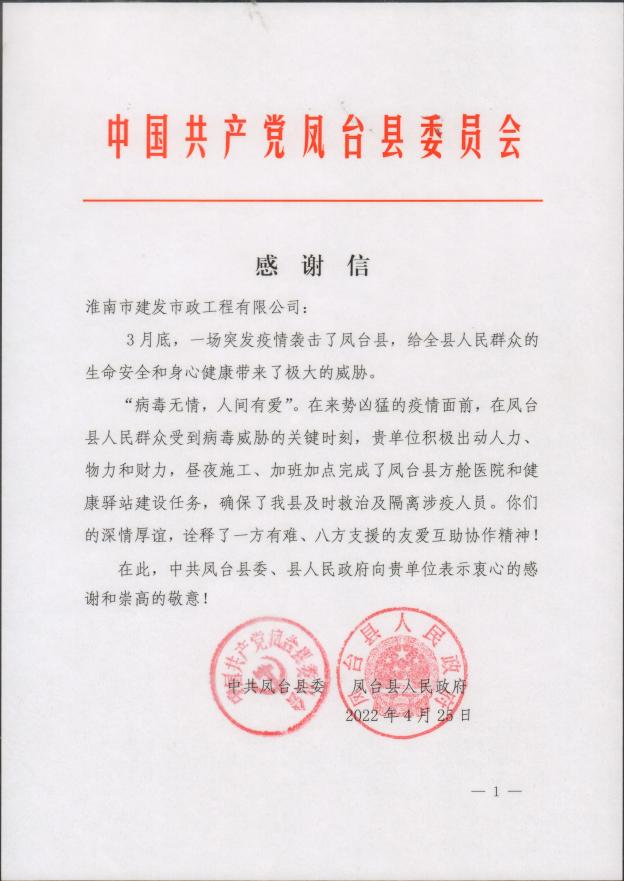 4月25日,,,,,,,公司收到一封特殊的感谢信,,,,,,,信的落款是中共凤台县委、凤台县人民政府。。。。。。。。信中写道:“贵单位积极出动人力、物力和财力,,,,,,,昼夜施工,,,,,,,加班加点完成了凤台县方舱医院和健康驿站建设任务,,,,,,,确保了我县及时救治及隔离涉疫人员。。。。。。。。”